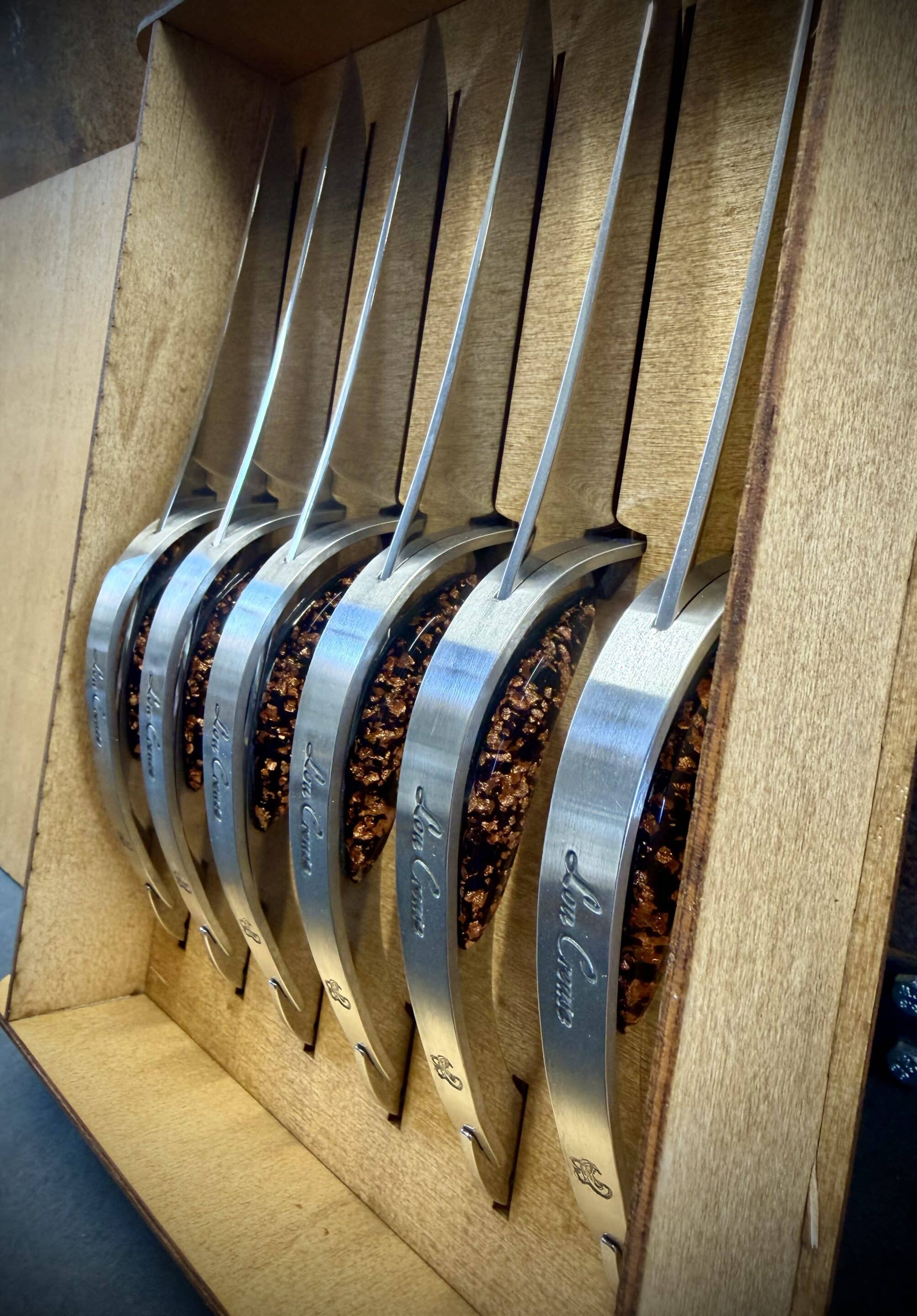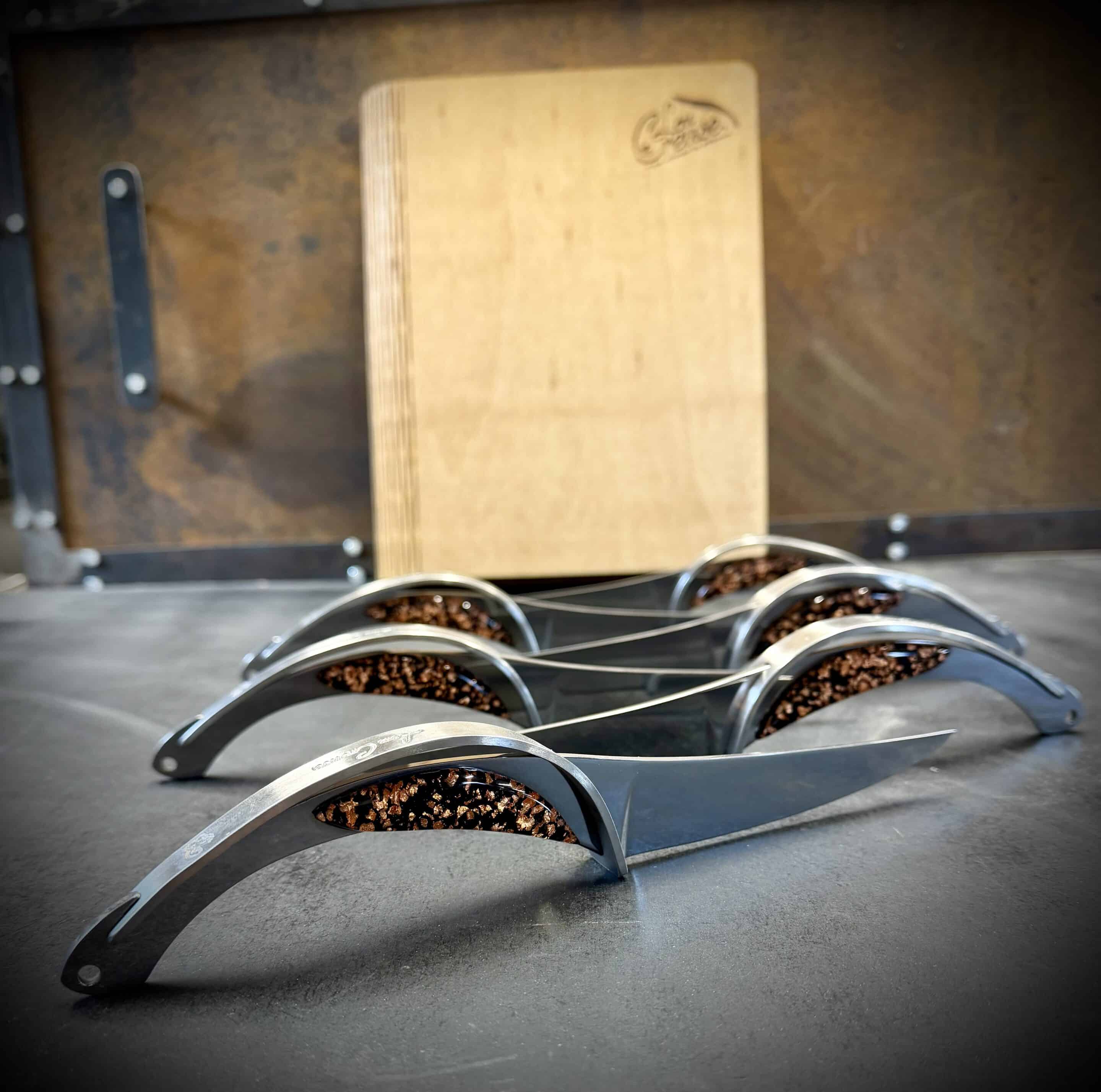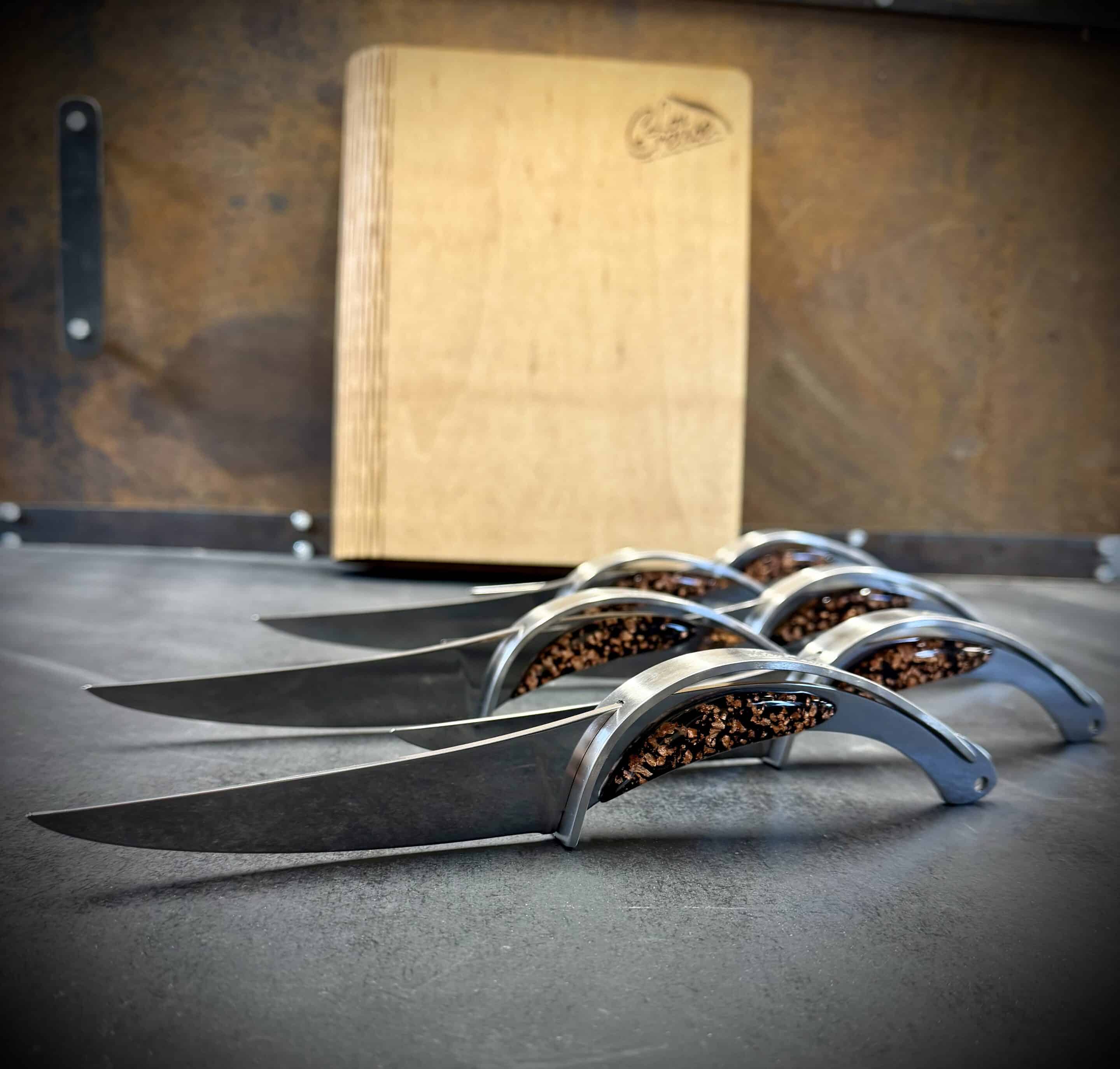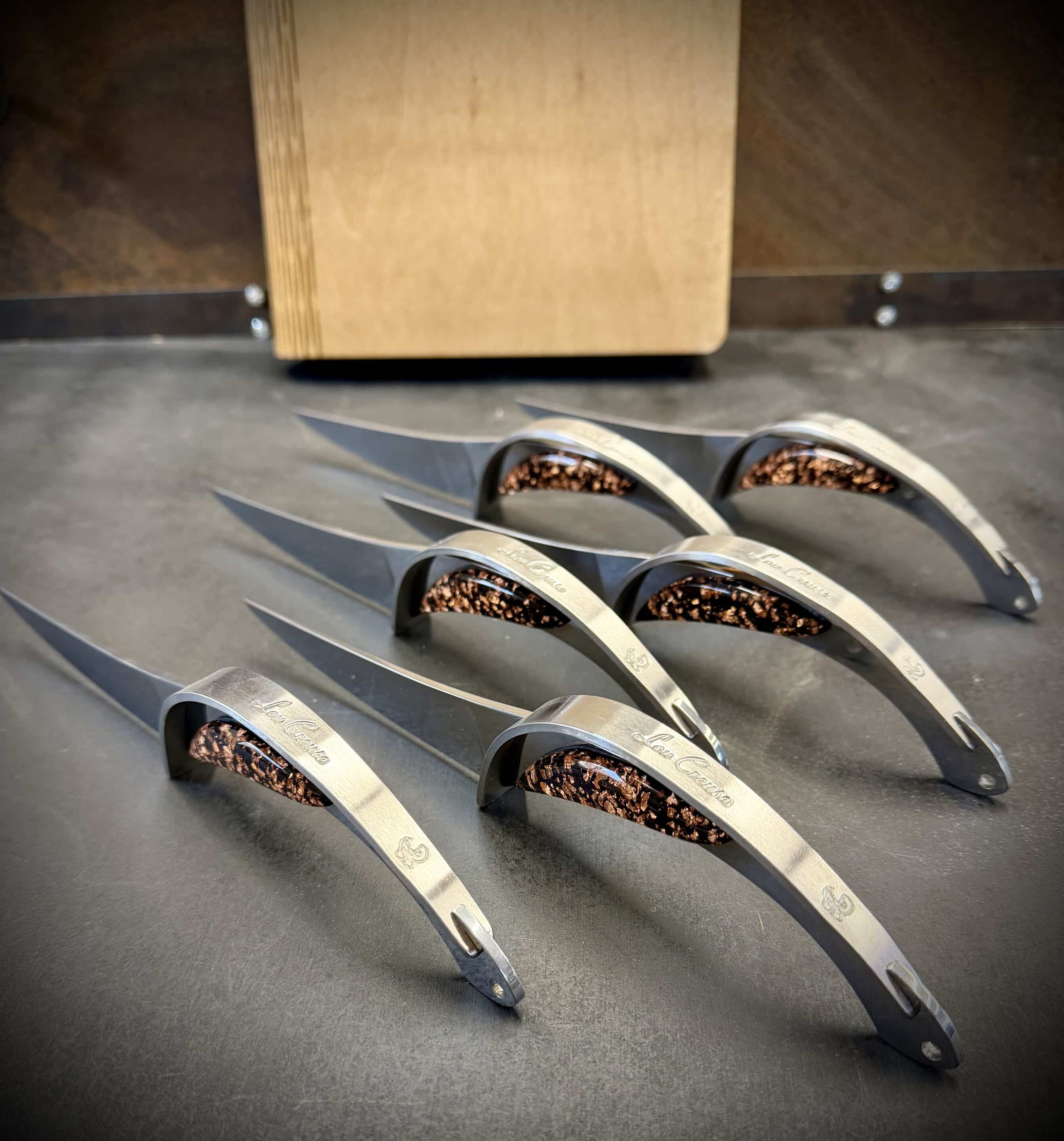 Les couteaux Lou Creuse d’art de la table sont conçus en acier inoxydable MA5 et disposent de plaquettes en différentes finitions : Granit Clair, Granit Bleu, Granit Sablé , Porcelaine Raku , Acacia , Feuille D’or et Feuille d’argent . Ils mesurent 24 cm de long et pèsent 105 g.